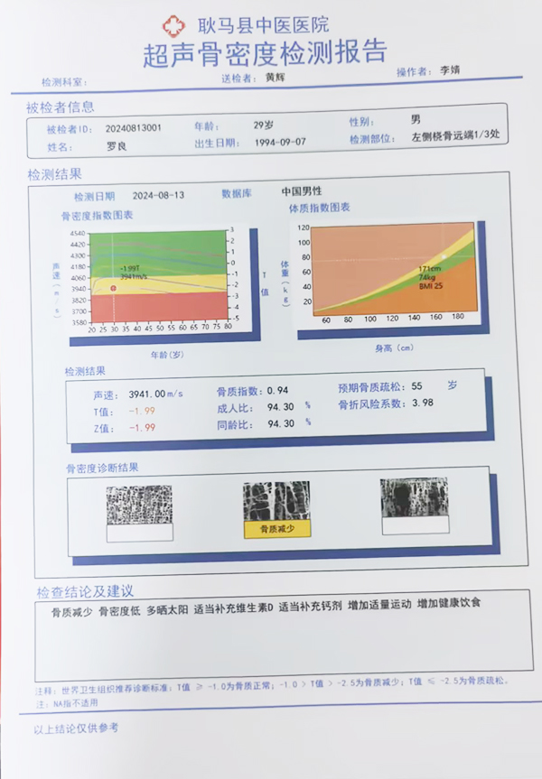 骨密度檢測是評估骨骼健康狀況的重要方法,對于早期發(fā)現(xiàn)骨質(zhì)疏松、預(yù)測骨折風(fēng)險、監(jiān)測治療效果等具有重要意義。以往,患者需要前往上級醫(yī)院或?qū)I(yè)機構(gòu)進行骨密度檢測,不僅費時費力,還可能延誤病情。此次耿馬縣中醫(yī)醫(yī)院引進的品源醫(yī)療超聲骨密度檢測儀,具備多部位測量(橈骨、脛骨)和多傳感器探頭的技術(shù)優(yōu)勢,能夠?qū)崿F(xiàn)對不同年齡段人群的全面檢測。其內(nèi)置的少年兒童數(shù)據(jù)庫(0-12歲)、青少年數(shù)據(jù)庫(12-20歲)、成年人數(shù)據(jù)庫(20-80歲)、老年人數(shù)據(jù)庫(80-100歲),使得檢測結(jié)果更加貼合不同人群的實際情況。