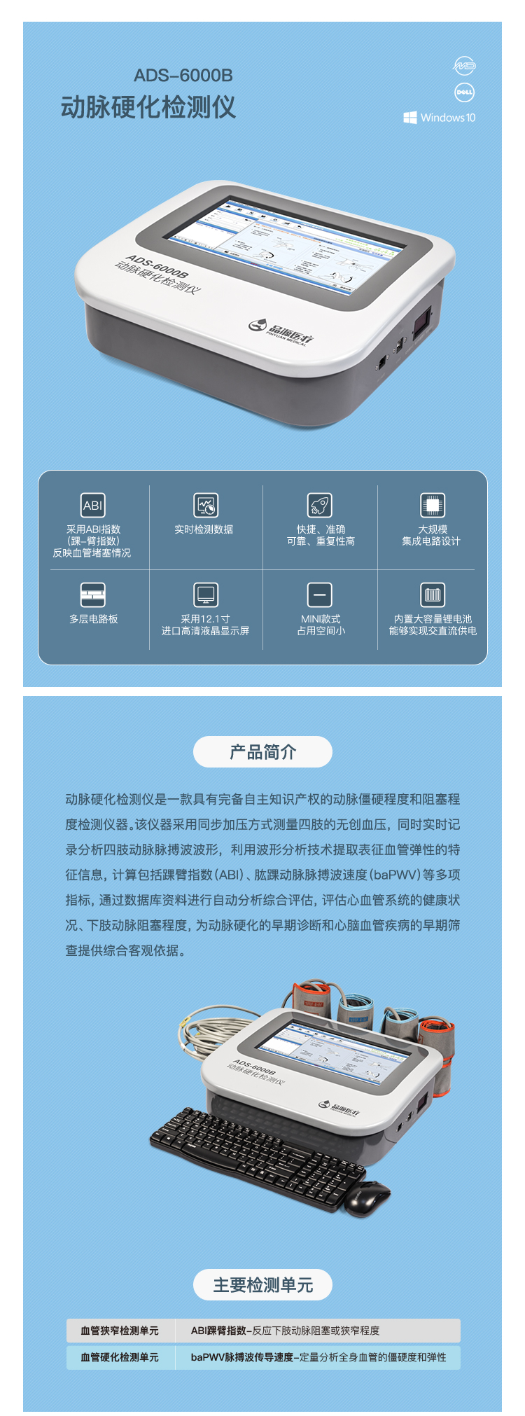 動(dòng)脈硬化檢測(cè)儀是一種用于檢測(cè)動(dòng)脈硬化程度的醫(yī)療設(shè)備。它可以通過測(cè)量動(dòng)脈的輪廓來評(píng)估動(dòng)脈的硬化程度,從而幫助醫(yī)生和患者更好地了解動(dòng)脈的健康狀況,以及制定更有效的治療方案。